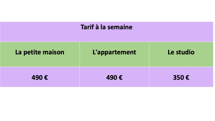 Les tarifs des gîtes sont à la semaine, du samedi au samedi, et comprennent la fourniture des draps ainsi que le chauffage en basse saison. Il faut y ajouter 40 € de frais de ménage pour la durée du séjour.